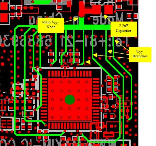 設(shè)計RF電路時,電源電路的設(shè)計和電路板布局常常被留到高頻信號通路的設(shè)計完成之后。對于沒有經(jīng)過深思熟慮的設(shè)計,電路周圍的電源電壓很容易產(chǎn)生錯誤的輸出和噪聲,從而對RF電路的系統(tǒng)性能產(chǎn)生負面影響。合理分配PCB的板層、采用星形拓撲的VCC引線,并在VCC引腳加上適當(dāng)?shù)娜ヱ铍娙荩瑢⒂兄诟纳葡到y(tǒng)的性能,獲得最佳指標。合理的PCB層分配便于簡化后續(xù)的布線處理,對于一個四層PCB(WLAN中常用的電路板),在大多數(shù)應(yīng)用中用電路板的頂層放置元器件和RF引線,第二層作為系統(tǒng)地,電源部分放置在第三層,任何信號線都可以分布在第四層。第二層采用不受干擾的地平面布局對于建立阻抗受控的RF信號通路非常必要,還便于獲得盡可能短的地環(huán)路,為第一層和第三層提供高度的電氣隔離,使得兩層之間的耦合最小。當(dāng)然,也可以采用其它板層定義的方式(特別是在電路板具有不同的層數(shù)時),但上述結(jié)構(gòu)是經(jīng)過驗證的一個成功范例。大面積的電源層能夠使VCC布線變得輕松,但是,這種結(jié)構(gòu)常常是導(dǎo)致系統(tǒng)性能惡化的導(dǎo)火索,在一個較大平面上把所有電源引線接在一起將無法避免引腳之間的噪聲傳輸。反之,如果使用星形拓撲則會減輕不同電源引腳之間的耦合。圖1給出了星形連接的VCC布線方案,該圖取自MAX2826IEEE802.11a/g收發(fā)器的評估板。圖中建立了一個主VCC節(jié)點,從該點引出不同分支的電源線,為RFIC的電源引腳供電。每個電源引腳使用獨立的引線,為引腳之間提供了空間上的隔離,有利于減小它們之間的耦合。另外,每條引線還具有一定的寄生電感,這恰好是我們所希望的,它有助于濾除電源線上的高頻噪聲。