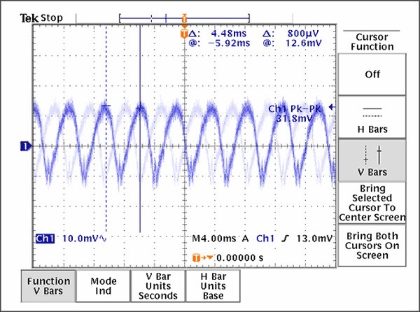 [page]經(jīng)驗證明,抑制PLL雜散的有效途徑是合理的接地、電源布局和去耦技術(shù),本文討論的布線原則是減小PLL雜散分量的良好設(shè)計開端。考慮到電荷泵中存在較大的電流變化,采用星形拓撲非常必要。如果沒有足夠的隔離,電流脈沖產(chǎn)生的噪聲會耦合到VCO電源,對VCO頻率進行調(diào)制,通常稱為“VCO牽引”。通過電源線間的物理間隔和每個VCC引腳的去耦電容、合理放置接地過孔、引入一個串聯(lián)的鐵氧體元件(作為最后一個手段)等措施可以提高隔離度。上述措施并不需要全部用在每個設(shè)計中,適當(dāng)采用每種方式都會有效降低雜散幅度。圖9提供了一個由于不合理的VCO電源去耦方案所產(chǎn)生的結(jié)果,電源紋波表明正是電荷泵的開關(guān)效應(yīng)導(dǎo)致電源線上的強干擾。值得慶幸的是,這種強干擾可以通過增加旁路電容得到有效抑制。圖10顯示的是在電路改變后,在同一點的測量結(jié)果。