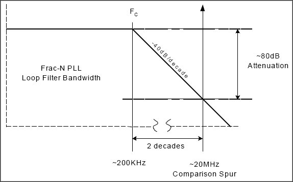 上述討論提出了另外一個問題,即如何有效地將PLL雜散成分限制在一定的范圍內(nèi),使其不對發(fā)射頻譜產(chǎn)生影響。一旦發(fā)現(xiàn)了雜散成分,首先想到的方案就是將PLL環(huán)路濾波器的帶寬變窄,以便衰減雜散信號的幅度。這種方法在極少數(shù)的情況下是有效的,但它存在一些潛在問題。圖8給出了一種假設(shè)情況,假設(shè)設(shè)計中采用了一個具有20MHz相對頻率的N分頻合成器,如果環(huán)路濾波器是二階的,截止頻率為200kHz,滾降速率通常為40dB/十倍頻程,在20MHz頻點可以獲得80dB的衰減。如果參考雜散成分為-40dBc(假設(shè)可以導(dǎo)致有害的調(diào)制分量的電平),產(chǎn)生雜散的機制可能超出環(huán)路濾波器的作用范圍(如果它是在濾波器之前產(chǎn)生的,其幅度可能非常大)。壓縮環(huán)路濾波器的帶寬將不會改善雜散特性,反而提高了PLL鎖相時間,對系統(tǒng)產(chǎn)生明顯的負面影響。