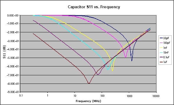 之后,電容的阻抗將呈現(xiàn)出電感性。由此可見,電容器只是在頻率接近或低于其SRF時才具有去耦作用,在這些頻點電容表現(xiàn)為低阻。圖3給出了不同容值下的典型S11參數(shù),從這些曲線可以清楚地看出它們的SRF,還可以看出電容越大,在較低頻率處所提供的去耦性能越好(所呈現(xiàn)的阻抗越低)。