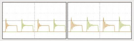 在反向恢復(fù)電流波形中,從零到峰值反向電流的這段時間被稱為ta。tb則定義為從峰值回到零的時間。軟度因子定義為tb/ta。一個軟器件的軟度因子大于1,而當(dāng)其軟度因子小于1時,該器件被認(rèn)為是“snappy(活躍的)”。從圖10可看出,反向恢復(fù)期間snappy二極管的峰值電壓較大。當(dāng)所有條件都相同時,snappy二極管的電壓尖刺總是比較高,因此會在緩沖電路中造成額外的損耗。輕載條件下,這一點可能比把導(dǎo)通阻抗RDS(on)減小1毫歐還要來得重要。圖11所示為諧振頻率為400kHz的500W PSFB DC-DC轉(zhuǎn)換器中軟器件與snappy器件的工作波形。軟器件的峰值電壓比snappy器件的小10%,從而可使緩沖電路的功耗降低30%,系統(tǒng)效率提高0.5%。盡管軟器件的RDS(on)比snappy器件的要高25%,但在20%負(fù)載條件下,二者的效率分別為94.81%與94.29%。滿載下兩個器件的效率相同。