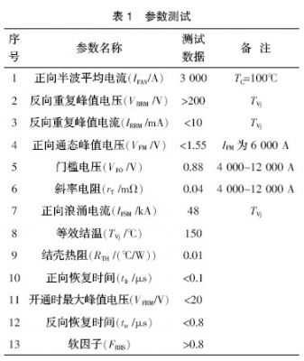 測試研制生產(chǎn)的器件,以規(guī)格是直徑48 mm/3 000 A/200 V的器件為例,記錄實測結(jié)果如表1所列。