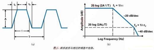 對(duì)于CCM中運(yùn)作的降壓轉(zhuǎn)換器,電感電流一直是非零的正電流。在這種情況下,負(fù)載周期為D=Vout/Vin,在本例中為38%(5V/14V)。使用200kHz的開關(guān)頻率時(shí),我們很快計(jì)算出導(dǎo)通時(shí)間為1.8μs。為支持此頻率,控制開關(guān)的上升/下降時(shí)間必須小于90納秒。這使得我們注意到第一個(gè)減少噪聲的方法,也就是斜率控制。您可能還無法理解,但是此時(shí)我們非常了解與PWM切換節(jié)點(diǎn)有關(guān)的諧波,也就是開關(guān)穩(wěn)壓器的控制波形。如果將此波形以圖1(a)中所示的梯形表示,波形的諧波便能夠以圖1(b)中的內(nèi)容表示,這表明了EMI背后的驅(qū)動(dòng)因素。這一傅里葉包絡(luò)定義了可通過傅里葉分析或計(jì)算梯形波形導(dǎo)通時(shí)間及上升時(shí)間取得的諧波振幅。
