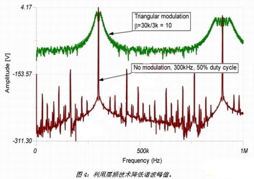 最后,本文將探討另一項(xiàng)越來越受到廣泛使用的技術(shù),能夠?qū)⒎逯抵C波能量散布于較大的頻帶,以有效降低該能量。該技術(shù)被稱為展頻頻率抖動(dòng)(SSFD),能夠通過諧波峰值的降低將噪聲信號(hào)從窄頻變成寬頻,以改變?cè)肼曨l譜。其中必須了解能量頻譜的變化,而整個(gè)能量則維持不變。最終的結(jié)果是噪聲水平一般會(huì)增加,從而損害高保真系統(tǒng)。圖4顯示發(fā)生的諧波擴(kuò)散及峰值降低。一般降低的幅度為5至10dB,后續(xù)的諧波會(huì)增加峰值降低的幅度。