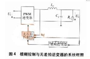 將輸出電壓和濾波電感電流反饋,即電壓誤差和電感電流作為輸入模糊變量,可以實(shí)現(xiàn)逆變器的模糊控制,整流性負(fù)載時(shí),其輸出電壓總諧波失真(total harmonic distortion,TH)小于5%,將模糊控制與無差拍控制相結(jié)合,可用來補(bǔ)償由于非線性負(fù)載導(dǎo)致的電壓降落,其系統(tǒng)如圖4所示。模糊控制從模仿人的思維外特性入手,模仿人的模糊信息處理能力。它對(duì)系統(tǒng)的控制是以人的經(jīng)驗(yàn)為依據(jù)的,而人的經(jīng)驗(yàn)正是反映人在思維過程中的判斷、推理、歸納。理論上已經(jīng)證明,模糊控制可以任意精度逼近任何線性函數(shù),但受到當(dāng)前技術(shù)水平的限制,模糊變量的分檔和模糊規(guī)則都受到一定的限制,隸屬函數(shù)的確定還沒有統(tǒng)一的理論指導(dǎo),帶有一定的人為因素,因此,模糊控制的精度有待于進(jìn)一步提高?! ?/p>