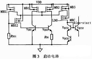 這樣雖然能啟動(dòng),但是,正常工作時(shí),此大啟動(dòng)電流bias-start將通過VQCS1和VQCS3流向地,增加了系統(tǒng)的負(fù)擔(dān)。因此,在電流輸出管MB3下加入控制管MBC,并使得在正常工作時(shí),LDO的高電壓足以使MBC關(guān)斷,從而降低啟動(dòng)電路的損耗。