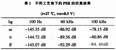 表1為輸出電壓bg在不同工藝角下的PSR的仿真結(jié)果,本電路在不同工藝角下都能在高電源干擾的芯片中正常工作。