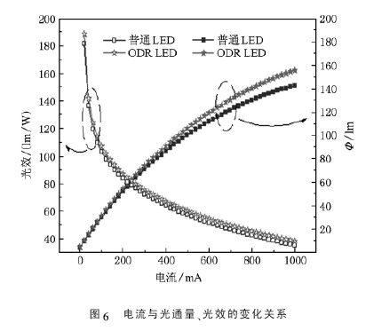 對兩種LED 的光通量和光效隨電流變化進(jìn)行測量,測量條件與I-V 特性測試相同. 結(jié)果如圖6 所示,從圖中明顯看出,兩種LED 的光通量隨著電流升高而逐漸升高,光效均隨著電流的升高而逐漸降低; 而ODR LED 的光通量和光效要始終高于普通LED,這從光通量和光效隨電流變化的角度來證實(shí)了ODR LED 的優(yōu)勢.