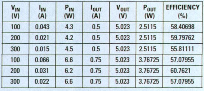 電容C4值設(shè)定大于Q4的柵極電容,但其必須足夠小,以便在更短控制器最小導(dǎo)通與斷開(kāi)時(shí)間期間能夠得到再充電。圖3顯示了300V和500mA負(fù)載輸入電壓下,一個(gè)開(kāi)關(guān)周期的柵極和漏極導(dǎo)通/斷開(kāi)時(shí)間。表1顯示了測(cè)得的轉(zhuǎn)換效率。