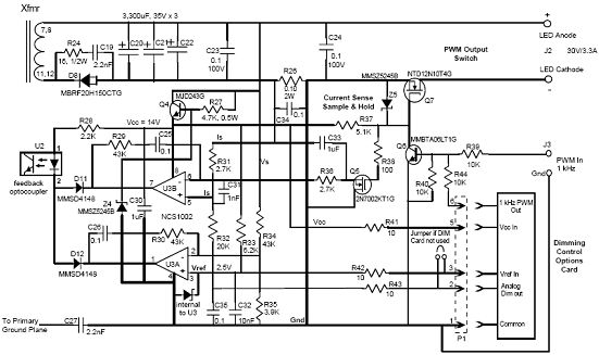 利用這個(gè)電路可以實(shí)現(xiàn)具有PWM調(diào)光輸入和可選調(diào)光卡的30 Vout LED驅(qū)動(dòng)器CVCC次級(jí)檢測(cè)。