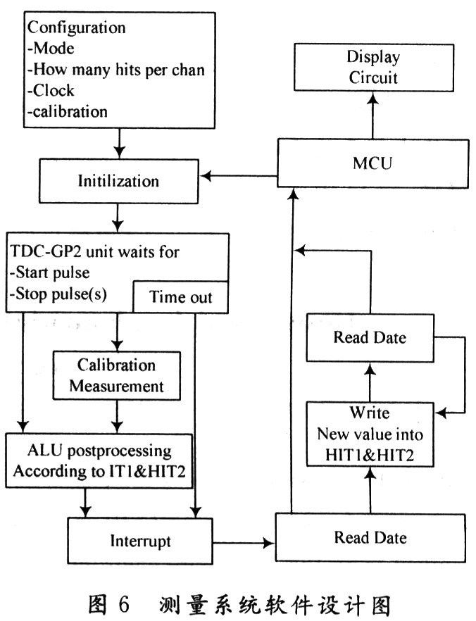 初始化之后,TDC-GP2高速測(cè)量單元接收到START脈沖后開(kāi)始工作,達(dá)到設(shè)置的采樣數(shù)或者遇到測(cè)量溢出后才停止工作。軟件設(shè)計(jì)的重點(diǎn)在于根據(jù)需要設(shè)置TDC-GP2的工作模式和讀取其內(nèi)部的測(cè)量數(shù)據(jù)。在測(cè)量結(jié)尾,ALU開(kāi)始依照HIT1和HIT2的設(shè)置處理數(shù)據(jù)并把結(jié)果送入輸出寄存器。如果不進(jìn)行校準(zhǔn),ALU傳輸16位原始數(shù)據(jù)到輸出寄存器;如果進(jìn)行校準(zhǔn),則ALU傳輸32位的固定浮點(diǎn)數(shù)到輸出寄存器。然后通過(guò)單片機(jī)AT89S52處理后,在液晶顯示器讀取時(shí)間間隔數(shù)據(jù),其測(cè)量流程如圖6所示。