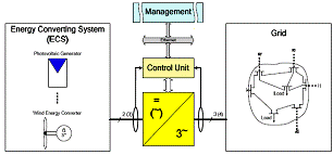 今天,DERs和RESs所使用的逆變器仍然主要采用了被動控制技術(shù)。這意味著對電網(wǎng)接入功率的控制與通過一次能源產(chǎn)生電能的能量轉(zhuǎn)換系統(tǒng)密切相關(guān)。對電網(wǎng)側(cè)來說,它們相當(dāng)于負(fù)的負(fù)載。它們將從ECS處獲得的全部功率注入電網(wǎng)。在這種方式下,電網(wǎng)側(cè)的電網(wǎng)控制整合,甚至于主動參與控制和穩(wěn)定電網(wǎng)狀態(tài)變量都是不可能的。