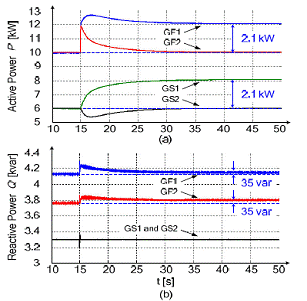 一段時間后,二次控制器控制逆變器動作,第一個電網(wǎng)上的階躍負(fù)載只由第一個電網(wǎng)上的逆變器補(bǔ)償。交換功率受到控制重新回到之前的設(shè)定值。不同逆變器的無功功率如圖7b所示。開始時,所有逆變器提供的無功功率都近似為14.6kvar。15s的時候,第一個電網(wǎng)的無功功率增加了70var。正如前面提到的,本次仿真并沒有對無功功率進(jìn)行二次控制。電網(wǎng)形成方式的逆變器補(bǔ)償增加的階躍負(fù)載,電網(wǎng)支持方式的逆變器提供相同數(shù)量的無功功率。