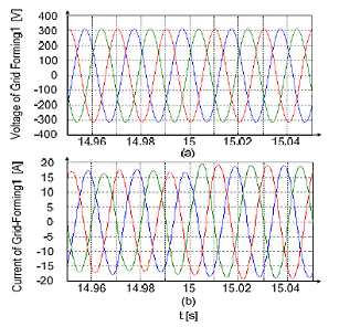 第一個電網(wǎng)形成方式的逆變器在連接點(diǎn)處的電壓和電流如圖9所示。逆變器電壓幾乎不受干擾,與此同時,只有電流去適應(yīng)相關(guān)負(fù)載情況。