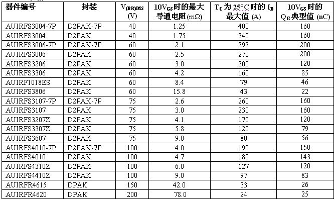 全新溝道 HEXFET 功率 MOSFET 系列采用多款表面貼裝器件 (SMD) 封裝,電壓范圍從 40V 至 200V。標(biāo)準(zhǔn)和邏輯電平柵級驅(qū)動 MOSFET 都為 IR 車用塑料封裝 MOSFET 產(chǎn)品系列設(shè)定了導(dǎo)通電阻性能新標(biāo)準(zhǔn)?;鶞?zhǔn)導(dǎo)通電阻在 40V 下最大為 1.25 毫歐,60V 下最大為2.1 毫歐,75V 下為 2.6 毫歐,100V 下為 4.0 毫歐。在 D2Pak-7P 封裝中許多器件的最大額定電流達 240A。