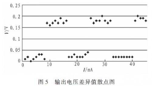 在軟硬件設(shè)計全部完成后的測試階段,發(fā)現(xiàn)DA輸出的電壓值在某些點上與理論值不符,具有較大差異并呈現(xiàn)一定的周期性(且都是輸出值比理論值小)。通過初步分析,認為是DA的控制字寫入在某些點上不正確,于是將硬件電路上AD的模擬電壓輸入引腳斷開并直接接在DA電壓輸出腳,并編寫了測試小程序,將0~5V每次遞增0.02V對應的控制字寫入DA,用AD測其輸出電壓值并將結(jié)果通過串口返回PC,然后將電壓理論值與實測值的差值全部導入Excel,然后在Excel中插入這些值的散點圖,散點圖如圖5所示,0~250mA電流值分別對應0~5V的電壓值(圖中截取了0~45mA這一段),縱坐標為輸出電壓理論值與實際值的差異值。