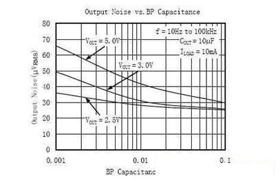 [page]為降低基準噪聲,用于連接基準旁路電容。增大旁路電容能夠使基準噪聲成為產(chǎn)生LDO輸出噪聲的次要因素,有利于減小輸出噪聲。建議使用陶瓷電容的典型值為 470 pF 到 0.01 µF 。也可使用此范圍以外的電容,但會對輸入電源上電時LDO 輸出電壓上升的速度產(chǎn)生影響,旁路電容值越大,輸出電壓上升速率越慢。在使用時這點要注意。