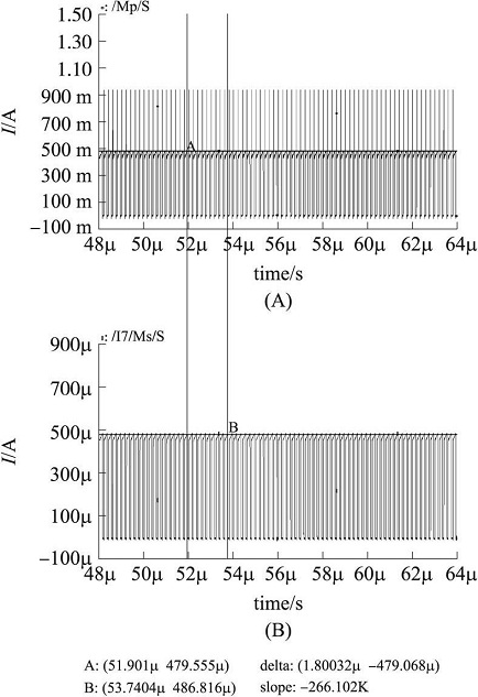 檢測精度和速度是電流檢測電路兩個(gè)重要的指標(biāo)。由于每個(gè)檢測周期的開始階段, 電流檢測電路處于啟動狀態(tài), 所以Is 都有一段啟動時(shí)間。這個(gè)時(shí)間主要由電路中M9、M10管的寄生電容決定, 當(dāng)兩管的寬度和長度比較小時(shí), 啟動時(shí)間很短, 相反, 啟動時(shí)間會變長。為了保證電流檢測的精度, M9、M10兩管的L 不能太小, 現(xiàn)取1 um。