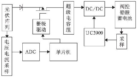 圖2 所示為基于U C3909 太陽能蓄電池充電器電路框圖, 光伏陣列經(jīng)過電壓電流采樣再經(jīng)模數(shù)轉換將數(shù)字信號反饋至單片機, 單片機根據(jù)光伏陣列的工作狀況輸出PWM 信號去驅動PMOS 管, 實現(xiàn)對光伏陣列的最大功率跟蹤。超級電容器組、DC/ DC 變換器、UC3909 用來實現(xiàn)對閥控鉛酸蓄電池的四階段充電控制, 并利用超級電容的特性優(yōu)化充放電過程。本文側重對超級電容器組、U C3909 及DC/ DC 變換器等部分實現(xiàn)對閥控鉛酸蓄電池四階段的充電分析及設計。