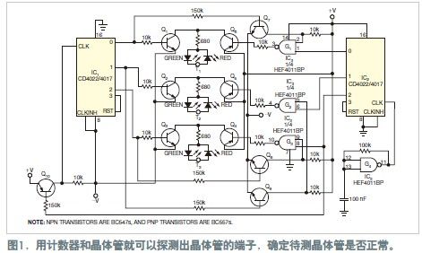 圖1中的簡單晶體管測試儀可以判斷出晶體管的類型,并且能幫助檢測出晶體管的發(fā)射極、集電極和基極。其方法是檢查被測晶體管三個端子T1、T2和T3之間流過的各種可能電流方向的組合。