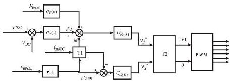 在正常工作條件下, 穩(wěn)壓器輸出穩(wěn)定的直流母線電壓和d 軸電流控制, 但是逆變器負(fù)荷不均衡, 就會(huì)產(chǎn)生波動(dòng)的直流電壓, 因此整流器在不平衡負(fù)載下會(huì)造成前端總諧波失真( THD) 的輸入電流。