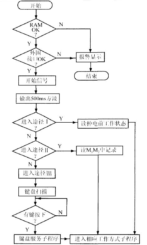 系統(tǒng)進(jìn)入相應(yīng)工作方式后,可通過中斷方式接受用戶命令,更換當(dāng)前工作狀態(tài)(中斷程序框圖省略)。圖5示出系統(tǒng)工作流程圖。