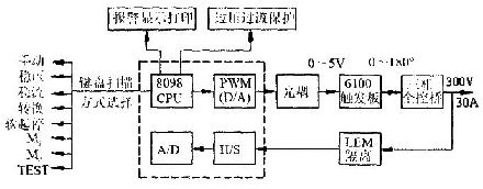 系統(tǒng)工作在開環(huán)狀態(tài),利用8098的PWM口,經(jīng)濾波后輸出一個(gè)0~5V的控制電壓信號(hào)給觸發(fā)板,使整流橋相應(yīng)輸出電壓為0~300V.該方式主要用于系統(tǒng)主電路的檢修和維護(hù)。