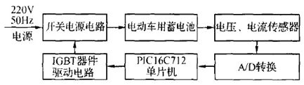 目前,電動(dòng)車電池作為一種儲(chǔ)能裝置,主要以鉛酸蓄電池為主,充電器是專門針對(duì)鉛酸蓄電池所設(shè)計(jì)的。傳統(tǒng)的蓄電池充電器采用電流/電壓負(fù)反饋的方法來達(dá)到恒流/恒壓充電的目的,為了實(shí)現(xiàn)充電過程各種工作參量的實(shí)時(shí)監(jiān)測(cè)及智能多段式充電策略的精確控制,引入電流/電壓反饋環(huán),應(yīng)用P IC16C712 單片機(jī)及相應(yīng)的控制電路,其硬件結(jié)構(gòu)框圖如圖1所示,電路圖如圖2所示。
