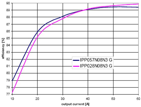 圖8表明了在實(shí)際應(yīng)用中,不同MOSFET RDS(on) 值范圍的影響。圖中所示為在服務(wù)器電源中分別測得的IPP028N08N3 G和IPP057N08N3 G的值。