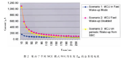 為了證明采用這種方法能夠節(jié)約電源,對(duì)現(xiàn)實(shí)生活中的實(shí)例進(jìn)行了評(píng)估。圖2顯示了普通系統(tǒng)基礎(chǔ)芯片(SBC)系統(tǒng)電流和S12X 車門系統(tǒng)電流在不同喚醒方法和圖1中顯示的時(shí)間參數(shù):