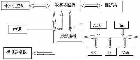 熱阻測試系統(tǒng)的基本構(gòu)架是計算機通過軟件控制精密模擬和數(shù)字電路,實現(xiàn)對被測器件的條件施加→結(jié)果采樣→篩選→計算→比較→判別等一系列程序控制,完成對被測器件電參數(shù)的自動測試,每次測試的全過程小于0.2秒。系統(tǒng)主要有模擬多路板、數(shù)字多路板、ADC板、Im 板、Ie板和Vcb板組成,如圖1所示。