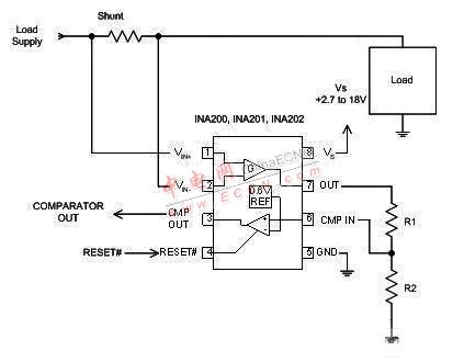 在許多應(yīng)用中,電流應(yīng)與某個(gè)設(shè)定值相比較。通常說來,進(jìn)行電流比較還需要電流分路.、比較器和參考電壓。此外,理想的比較器輸出應(yīng)與大多數(shù)常見的邏輯電路很好地兼容。圖 5 給出了電流比較的例子。在本例中,將電流與采用 TI INA200 系列電流分路.和比較器的簡單單電壓結(jié)點(diǎn)進(jìn)行了比較。R1 和 R2 形成分壓器,以根據(jù) INA200 系列比較器的內(nèi)置 0.6V 電壓結(jié)點(diǎn)來設(shè)置電壓結(jié)點(diǎn)。(INA200 系列的增益很有特點(diǎn):INA200 的增益為 20,INA201 的增益為 50,INA202的增益為 100。)
