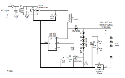 其實(shí)這個電源的核心就是一個恒流二極管NSI45025,以確保LED恒流在25mA。所以它只能用于小功率貼片式的LED。其中外加的集成電路NCP1014實(shí)際上是一個有源式的功率因數(shù)校正(PFC),可以把它的功率因數(shù)提高到>0.9以滿足美國能源之星的要求。輸入端的L1,C1,C2是一個防電磁干擾EMI的濾波器。它的缺點(diǎn)是非隔離,所以220V會直接加到負(fù)載LED上。但是歐盟IEC 61347-2-13 (5/2006)標(biāo)準(zhǔn)規(guī)定在LED負(fù)載端電壓不可超過25VAC或35VDC。所以采用非隔離電源是無法出口歐盟的。