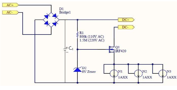 采用恒流二極管作為LED的恒流驅(qū)動具有結(jié)構(gòu)簡單,成本低廉的優(yōu)點(diǎn)。尤其適合于小功率市電LED燈具,如球泡燈和日光燈和吸頂燈。但是由于受到功耗的限制,它只能用于高壓小電流的情況。負(fù)載只能是多個小功率LED的串聯(lián)或是采用集成的“高壓LED”。而且,如果直接采用交流整流,電容濾波的方案,會有功率因素不高的缺點(diǎn),而必須采用無源功率因素補(bǔ)償?shù)姆桨?。這些都是在使用時需要考慮的。