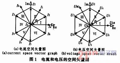 矩陣變換器應(yīng)用雙空間矢量調(diào)制法(SVM)時(shí)可以等效為一個(gè)虛擬的整流器和一個(gè)虛擬的逆變器,它們的6個(gè)有效的空間矢量分別如圖1所示,對(duì)輸入電流和輸出電壓分別進(jìn)行嵌套。從而有36種可能的扇區(qū)組合。