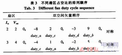 空間矢量調(diào)制法只確定開(kāi)關(guān)間隔中應(yīng)用電壓矢量的占空比,從而獲得低頻率的輸出電壓和輸入電流的平均值,但是并沒(méi)有確定使用的順序。所以需要使用雙空間矢量調(diào)制法,同時(shí)也可改善波形的質(zhì)量。圖2表明了輸入電流在4扇區(qū),輸出電壓在5扇區(qū)應(yīng)用雙空間矢量調(diào)制的順序。電壓矢量在開(kāi)關(guān)間隔中對(duì)稱(chēng)分布,零矢量每4個(gè)開(kāi)關(guān)間隔使用一次。在每次開(kāi)關(guān)轉(zhuǎn)換中只有一個(gè)開(kāi)關(guān)狀態(tài)發(fā)生改變以最大程度地降低損耗。在圖2中通過(guò)表格2確定相應(yīng)開(kāi)關(guān)時(shí)間: