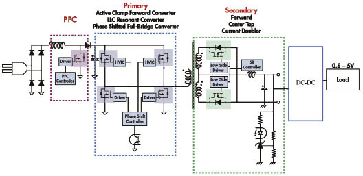 這里我們首先以AC-DC同步整流應用為例。在通訊電源的應用中它的主功率部分主要由功率校正電路、原邊的電源轉換電路、副邊的整流電路組成,我們可以很清楚的看到,在圖中有非常多的功率器件,系統(tǒng)的效率也就由這些功率器件的工作效率以及本身的性能優(yōu)劣決定。