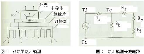 由于散熱器是開關(guān)電源的重要部件,它的散熱效率高與低關(guān)系到開關(guān)電源的工作性能。散熱器通常采用銅或鋁,雖然銅的熱導(dǎo)率比鋁高2倍但其價格比鋁高得多,故目前采用鋁材料的情況較為普遍。通常來講,散熱器的表面積越大散熱效果越好。散熱器的熱阻模型及等效電路如下圖所示。