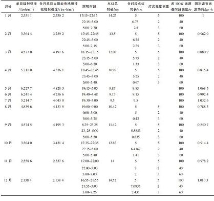 開關燈的時間根據(jù)天安門升降旗時間而定,如表1所示,全年最長點燈時長茌12月為14.52小時,最短為9.13小時。照明時間分為3個時段,第一個時段從當天天安門降旗時刻開始,為5個小時,第二個時段到早上5點,第三個時段從5點到滅安門升旗時刻,燈光亮度各時段權重比為5:2:3,如果以100 W光源為設計標準,則光源功耗最大為1.068 5 kW-h。