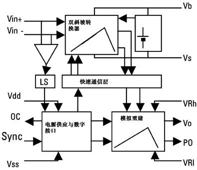 電機電流是通過使用一個外部分流晶體管來感測的,HVIC可將小的差分電壓(±250mV)通過一個精密電路轉(zhuǎn)換為時間間隔,這個精密電路的紋波去除功能有助于顯示小的群延遲。時間間隔是快速瞬變的,會被帶到輸出端。這樣就可以獲得與測量電流相對應(yīng)的模擬輸出電壓,以便與外部參考電壓相比較,最大采樣率為40kSPS。對于頻率高達20kHz的非對稱PWM調(diào)制來講,這個采樣速率富富有余。20kHz時的最大延遲小于7.5s,對于被用來IGBT保護的電流感測信號來說也夠快了。圖4是電流感測電路。