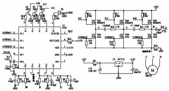 無位置傳感器控制系統(tǒng)以C8051F330單片機、逆變橋電路、端電壓檢測電路、穩(wěn)壓電路等組成。逆變橋電路中上橋臂為P型MOSFET器件FDS6679,下橋臂為N型MOSFET器件M4410B,均為低電壓驅(qū)動器件。FDS6679通過一個NPN型三極管驅(qū)動,而M4410B由C8051F330的P1口直接驅(qū)動(P1口設(shè)置成推挽輸出)。PWM控制模式定為:PWM僅應(yīng)用于半橋的下端MOSFET,同時換流的上端(對角線)MOSFET僅起換相通斷控制。