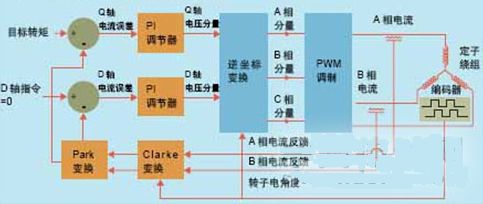 從控制原理上講,磁場定向控制方法的電流環(huán)運行是獨立于電機旋轉(zhuǎn)的。在FOC方法中存在兩個實際的電流環(huán),一個用于Q軸轉(zhuǎn)矩,另一個用于D軸轉(zhuǎn)矩。Q軸轉(zhuǎn)矩電流環(huán)施以來自伺服控制器的用戶目標(biāo)轉(zhuǎn)矩,D軸電流環(huán)則施以零輸進指令,以便使不想要的直軸分量降至最低。