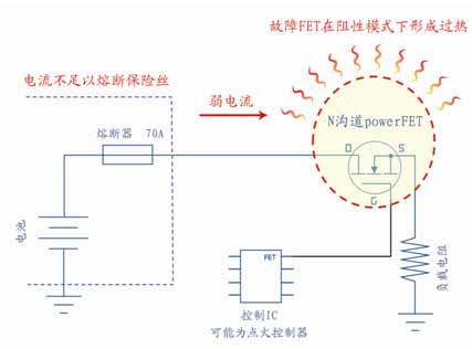 圖1 說明了一個出現(xiàn)故障的powerFET可能并不會產(chǎn)生一個完全硬短路的過流情況,而是產(chǎn)生阻性短路,因此通過I2R發(fā)熱造成不安全的溫度。在這種情況下,所形成的電流可能并沒有高到使一個標準保險絲熔斷并阻止印制電路板上的熱失控。
