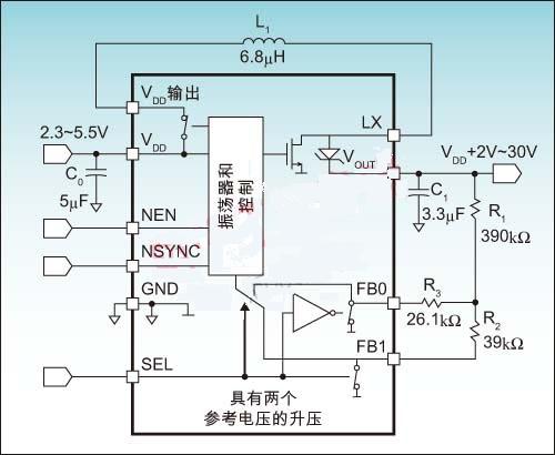 如上所述,當(dāng)OLED工作在暗的模式時(shí)可以通過降低輸出電壓顯著地節(jié)省功耗。因此為OLED電源選擇的最佳電源芯片應(yīng)包含能夠提供這一功能的電路。采用兩條獨(dú)立的反饋路徑就可實(shí)現(xiàn)這一功能,而且這兩條反饋路徑可以通過簡(jiǎn)單的邏輯輸入進(jìn)行選擇。因此通過這種方法就可簡(jiǎn)單地實(shí)現(xiàn)PMOLED中使用的亮→暗→關(guān)節(jié)電技術(shù)。