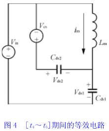 [t4~t5]期間電容cds1、cds2與lm發(fā)生諧振,并在t5時(shí)刻電壓vds1下降到vin,變壓器磁芯完成磁恢復(fù)。