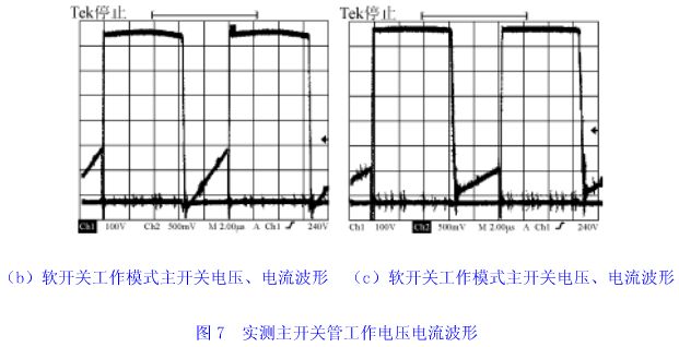 圖7(a)、7(b)、7(c)給出了實(shí)測(cè)的主開(kāi)關(guān)管工作電壓、電流波形。圖7(a)顯示主開(kāi)關(guān)管工作在硬開(kāi)關(guān)狀態(tài)。圖7(b)和圖7(c)分別是采用增加勵(lì)磁電流方法和應(yīng)用磁飽和電感器方法實(shí)現(xiàn)零電壓軟開(kāi)關(guān)的電壓電流波形,后者明顯地降低了勵(lì)磁電流和開(kāi)關(guān)管電流的峰值。實(shí)測(cè)波形與理論分析完全一致。圖8、9顯示出了實(shí)測(cè)的效率曲線(xiàn)。從圖9中看出,當(dāng)變換器開(kāi)關(guān)頻率增加時(shí),變壓器勵(lì)磁電流損耗和開(kāi)關(guān)管通態(tài)損耗所占比重增加,變換器效率降低了。實(shí)驗(yàn)結(jié)果驗(yàn)證了理論分析。