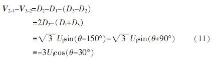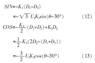 由于自整角機(jī)中定子繞組為星型連接,彼此在空間上呈120°,并且輸出三路定子繞組電壓D1、D2、D3是相對于中心點而言,無法對其單獨(dú)處理。由公式(5)可知,其任意兩線間電壓為: