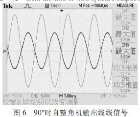 根據(jù)圖中所示,在確定的角度下,自整角機(jī)三路線線信號在電壓上呈120°正弦關(guān)系,接口電路轉(zhuǎn)換輸出信號為兩路電壓正交信號,根據(jù)角度不同,兩路信號電壓峰值不同,單路最大時電壓為2Vrms。測試結(jié)果完全符合設(shè)計要求。