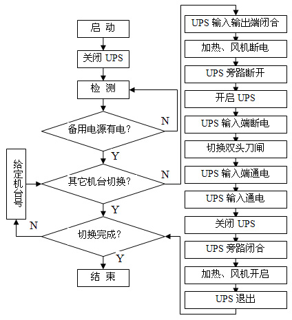 本系統(tǒng)設(shè)計(jì)利用美國山特公司3C3 UPS的特性,該UPS有一個(gè)內(nèi)部電子旁路檢修開關(guān),UPS在關(guān)機(jī)狀態(tài)下,電源是通過UPS內(nèi)部電子旁路直接輸出供電。外部再加一個(gè)旁路開關(guān)(圖1),外部旁路開關(guān)與內(nèi)部電子旁路開關(guān)形成并聯(lián)。UPS加入供電系統(tǒng)時(shí), UPS必須在關(guān)機(jī)狀態(tài)下,接通UPS輸入輸出端開關(guān),UPS與外部旁路開關(guān)形成并聯(lián)接通,然后斷開外部旁路開關(guān),再將UPS開機(jī)。UPS退出供電系統(tǒng)時(shí),必須先將UPS關(guān)機(jī),接通外部旁路開關(guān)(若UPS未在關(guān)機(jī)狀態(tài)下,相當(dāng)于UPS在開機(jī)時(shí)輸出端加入反向電壓,UPS可能燒毀),斷開UPS輸入輸出端開關(guān), UPS退出供電系統(tǒng)。這樣就很容易做到將UPS加入和退出供電系統(tǒng)中。