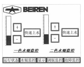 在人機界面中,設(shè)計了7幅畫面,包括整體圖形,故障顯示,機器速度和計數(shù)顯示,水輥速度顯示,調(diào)版監(jiān)控等。故障顯示使用指示器,給出位元件即可實現(xiàn)閃動效果,讓操作者很方便的知道故障部位,整體感很好。在水輥速度顯示中,設(shè)計了一個柱狀圖,可以顯示水量增加大小,只需按下柱狀圖,就可增加水量,同時也可方便監(jiān)控。如圖所示: